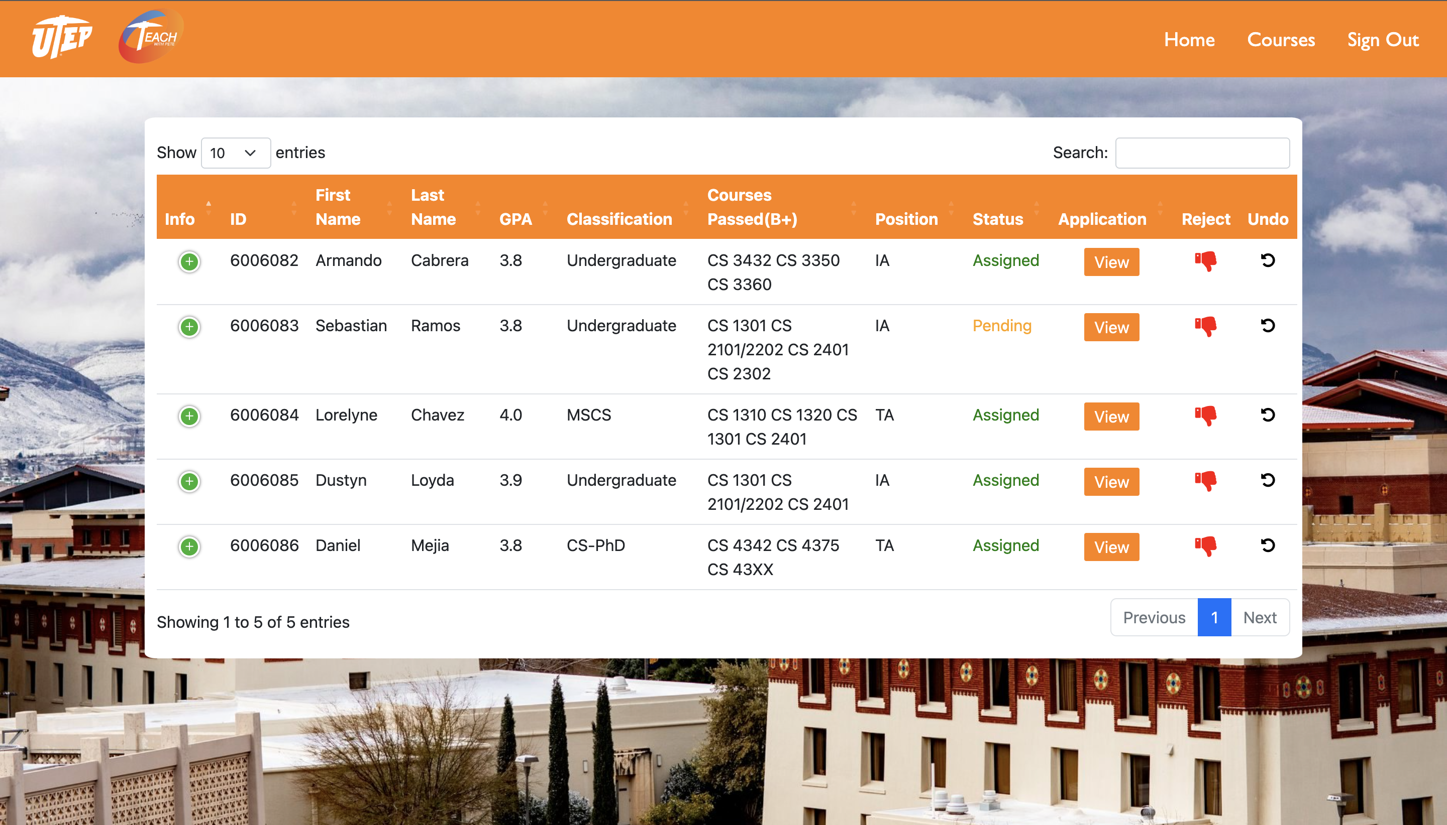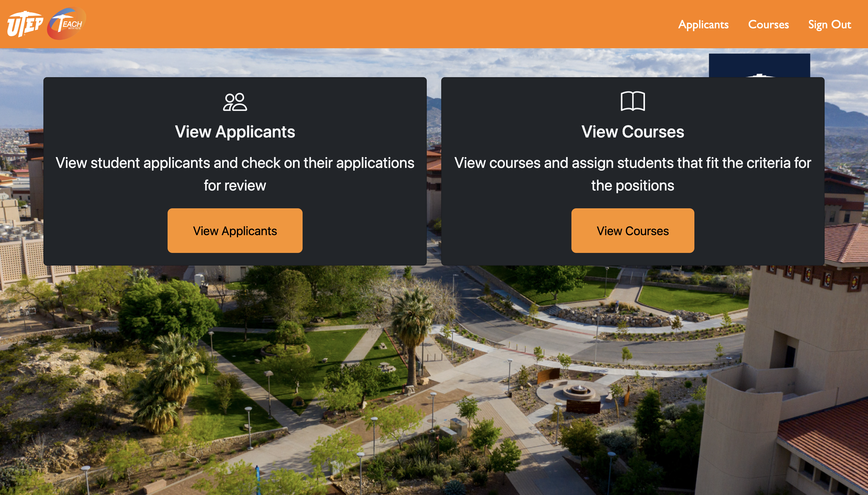 Computer Science department. There will be two types of users: managers and students. Each user already has an assigned role in our databae. Once logged in, our program will redirect the user to a clean and responsive dashboard to navigate for their necessary actions. Managers are able to access a list of courses and students that have applied for a position as a TA or IA. Here, the maanager can then hire and assign applicant to a specific course. Students will be able to access the application as well as check the status of their application.