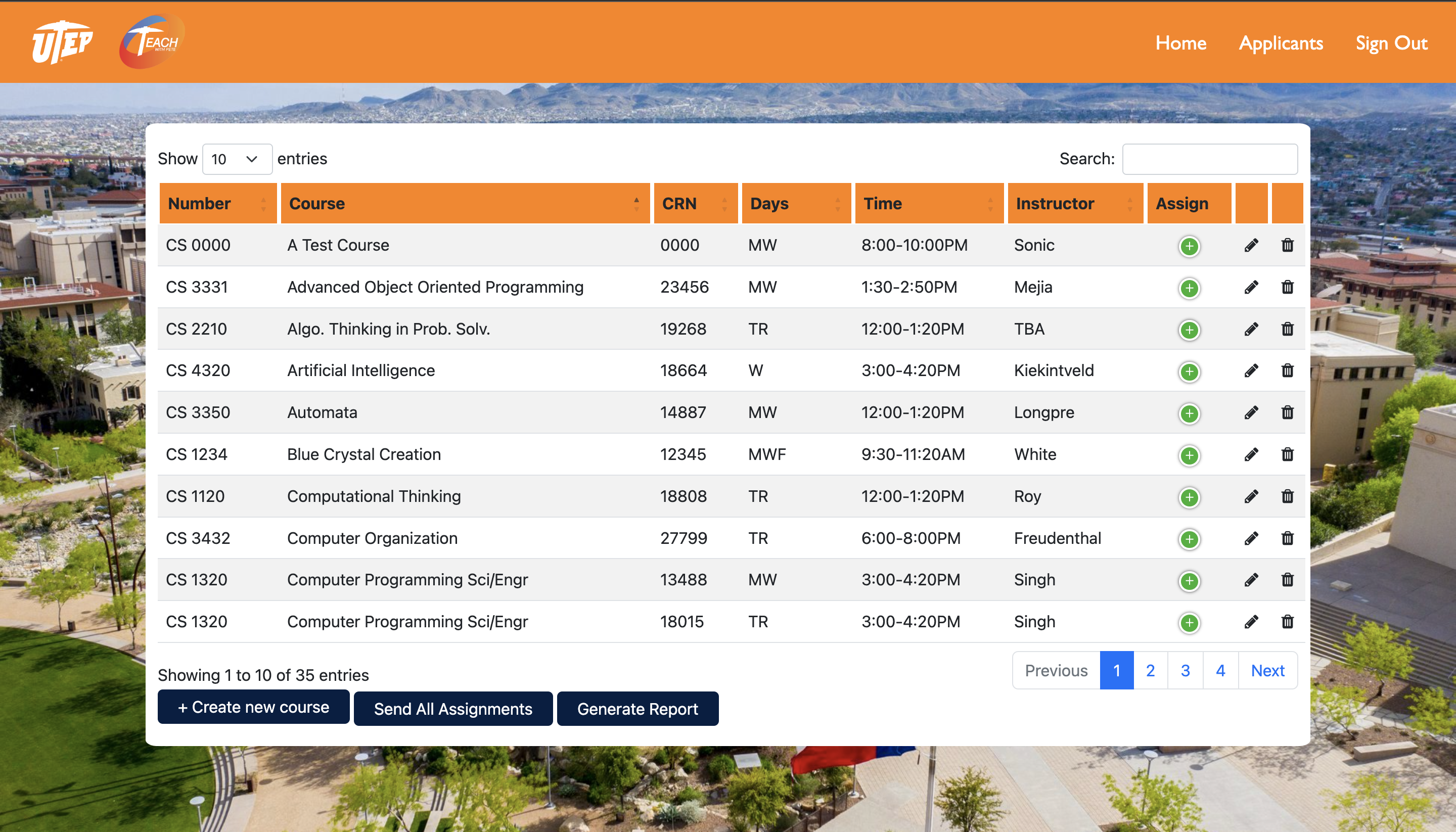- This page displays all the courses information on a table. The table allows the functionality to search and sort courses by any field, similar to the applicants page.