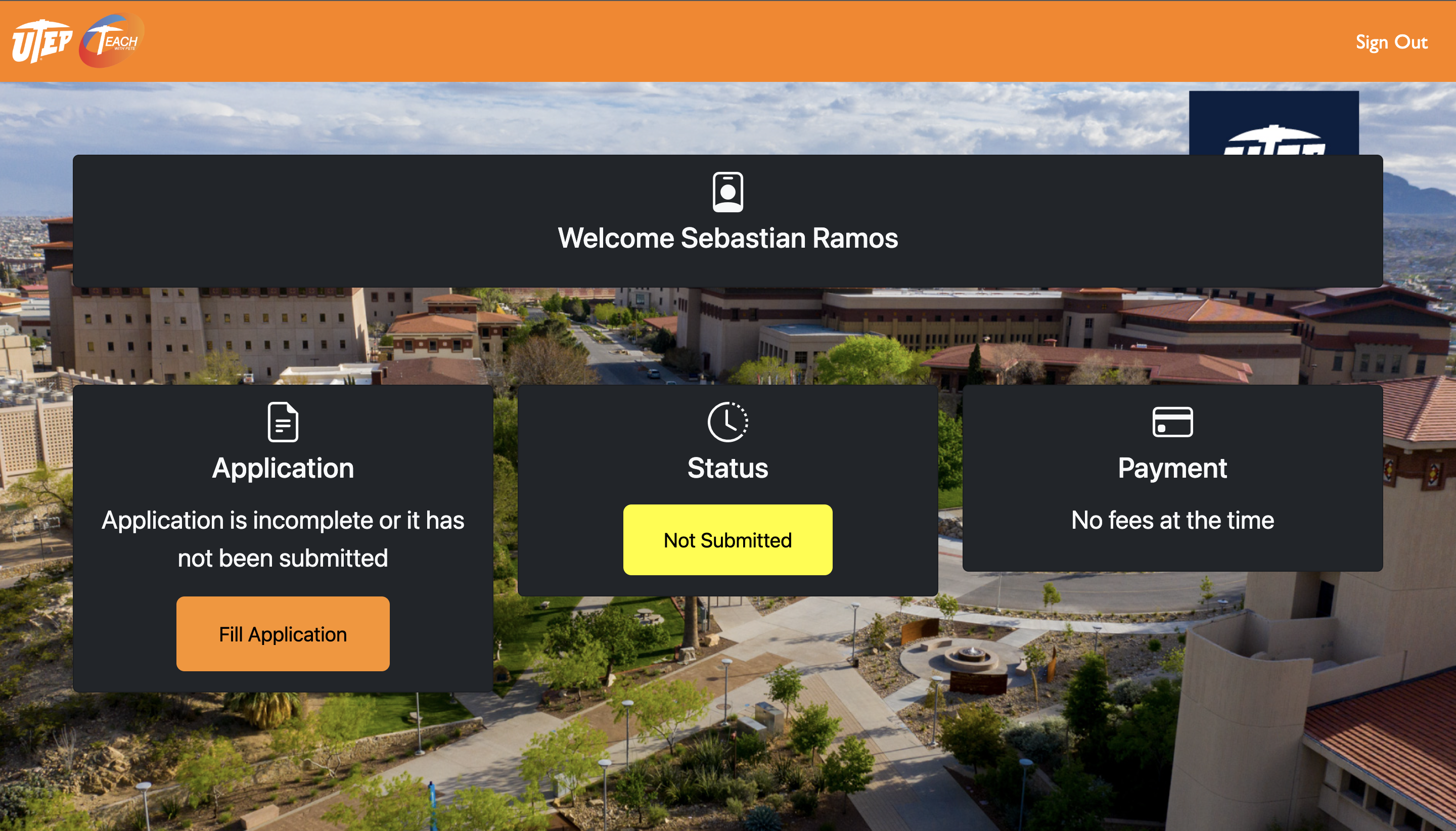 - This page will be the main dashboard that the student will have access to. The "Fill Application" button gives the user access to the application form for the IA/TA position. There will be a progress bar that will show the student their progress on their application depending on their status (If they havent completed the application, if submited or in progress, if payed or not and if they have been accepted or not). It is still a work in progress but it will be implemented into the student main page to have easier and faster access.